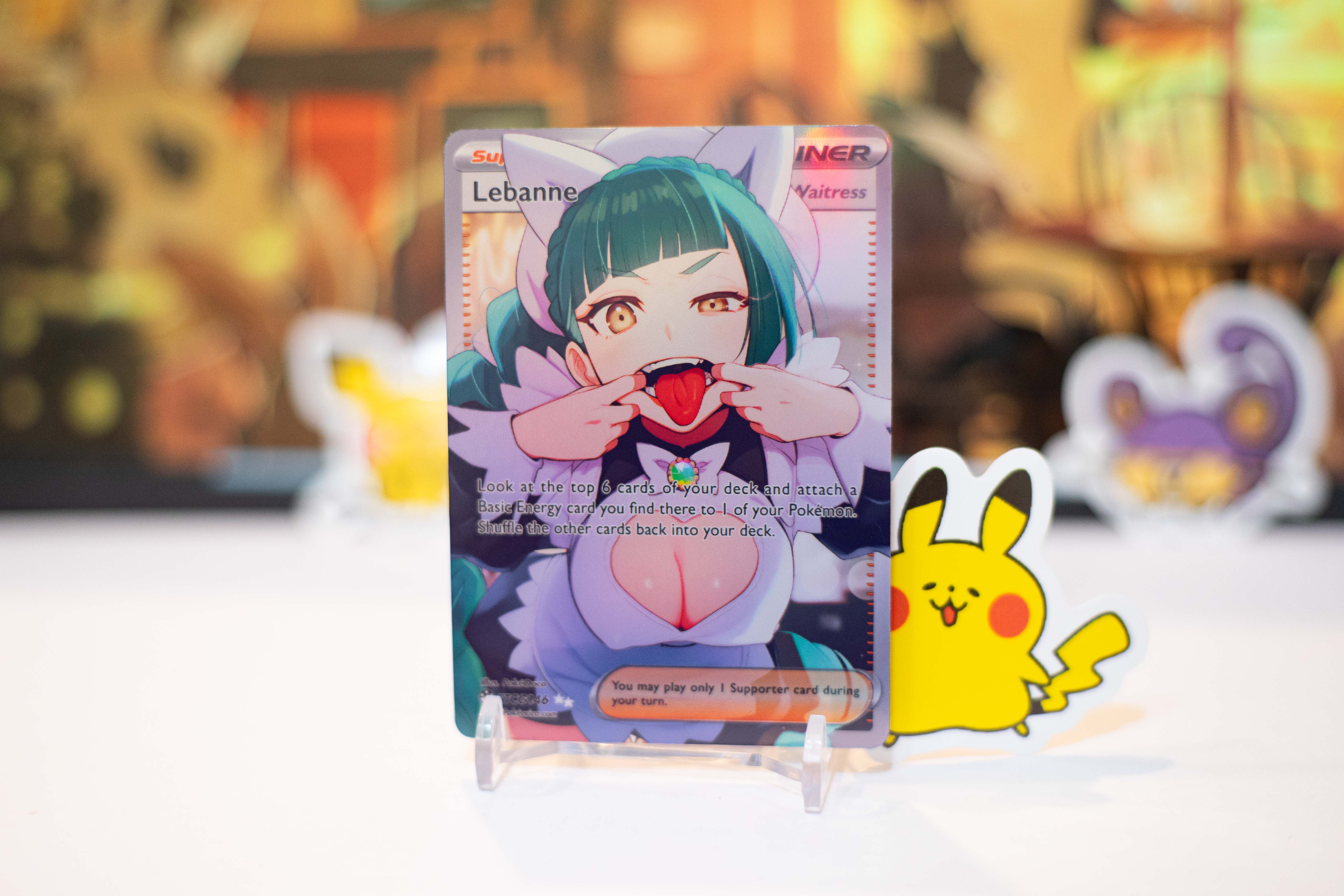 A custom made Holographic Full Art Card of Lebanne (Using the card effect of Waitress). Each card...