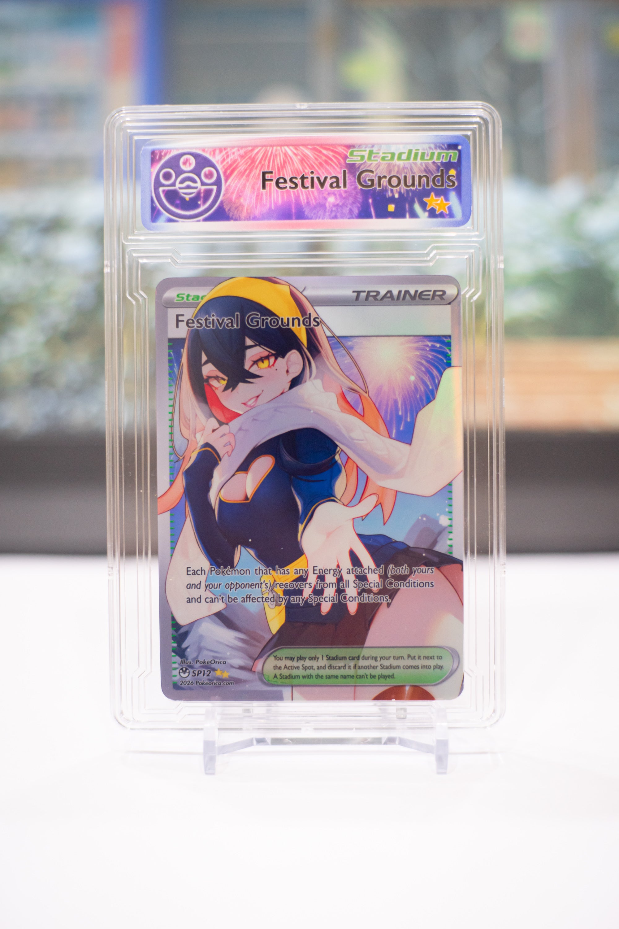 A custom made Holographic Full Art Card Slab of Festival Grounds Featuring Carmine available for only a limited time.